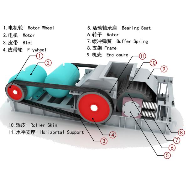 Two motors drive two roller to run at high speed, the material enters from the feeding mouth and collides with the two rollers. The two rollers move in opposite directions at the same time, so that the material is broken into the required discharging size. By adjusting the tightness of the screw at the spring, the distance between the two rollers can be adjusted to adjust the size of the discharging mouth.
